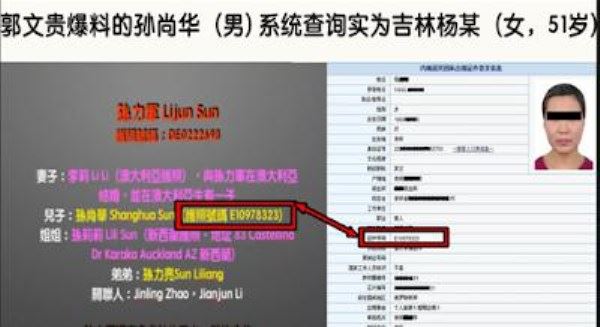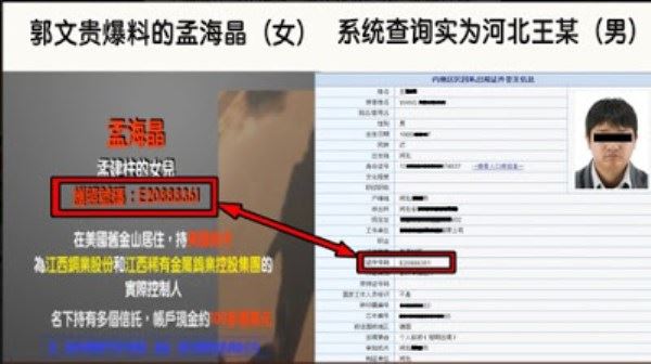二、关于孟海晶、孙尚华护照真相。关于护照号和海外公司的虚假之处,早有眼明的网民揭露出来:郭文贵爆料的孟建柱的女儿孟海晶的护照号码是:E20888361,其实这是河北1985年出生的男子王某的护照,护照照有效期2013年5月30日至2023年5月29日。郭文贵爆料的孙力军的儿子孙尚华的护照号码是:E10978323,这其实是吉林51岁的女子杨某的护照,护照有效期2013年1月5日至2023年1月4日。