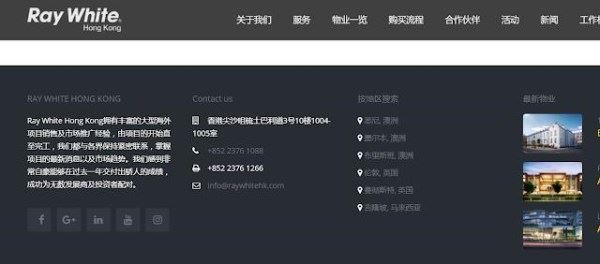 郭文贵展示的第九套房产图上有英文水印“Ray White Hong kong”字样,经查,Ray White Hong kong为香港一家海外房地产销售公司,位于香港尖沙咀梳士巴利道3号10楼1004-1005室。其网站主页如图: