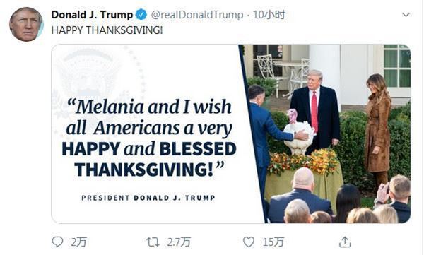 特朗普在照片旁的备注文字中写道:“梅拉尼娅和我祝愿所有的美国人感恩节幸福快乐!”