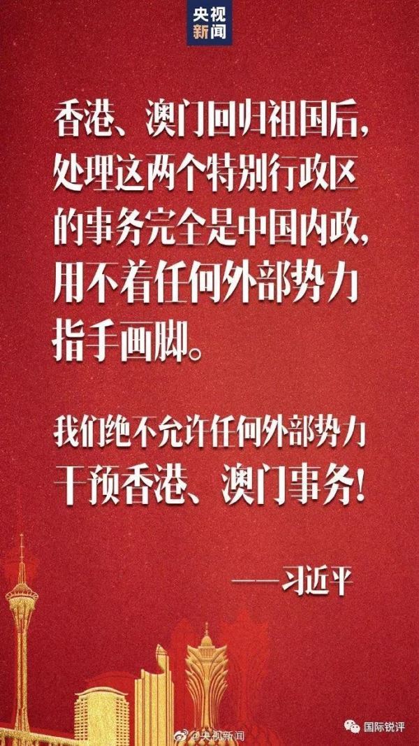 值得注意的是,“一国两制”实践在香港澳门取得的巨大成就,令一些见不得中国好的外部势力如芒刺在背。最近香港发生的激进暴力犯罪行为,其实质就是外部势力与反中乱港分子势力相互勾结,企图破坏 “一国两制”实践,阻碍中国发展大局,用心极为险恶。对此,习主席在讲话中发出正告:中国政府和中国人民维护国家主权、安全、发展利益的意志坚如磐石,绝不允许任何外部势力干预香港、澳门事务!这是继11月在巴西利亚金砖峰会表明三个“坚定不移”立场之后,中国最高领导人再次在公开场合就外部势力干涉中国内政表明严正立场,彰显了中国政府贯彻“一国两制”方针,维护国家主权、安全和发展利益的坚定意志,必定会对外部“黑手”形成强大震慑。