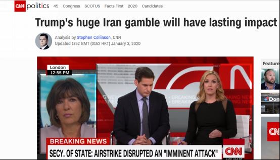 美国有线电视新闻网报道称,特朗普下令杀害伊朗情报领导人。这是他危险的赌博——赌上了他自己的政治生涯,也赌上了其他许多人的性命。
