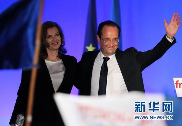 2012年5月6日,在法国南部城市图勒,社会党候选人弗朗索瓦·奥朗德(右)与女友瓦莱丽·特里埃维勒共同出席选后集会。新华社记者高静摄