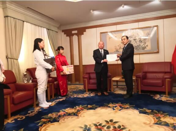 随后,一行人将饱含友情的50余万日元善款转交给孔大使。孔大使则将一本亲自题写有“相知无远近、万里尚为邻”的《中国世界遗产影像志》交给了小美。