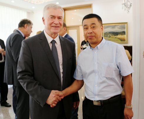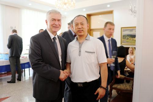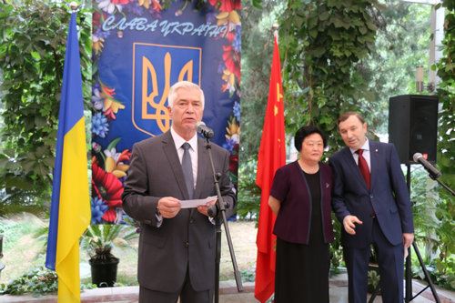 中乌友好人士、慈善企业家单玉志和乌克兰驻华大使奥列格焦明亲切交谈
