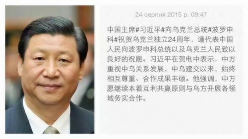 中国国家主席习近平乌克兰独立日24周年之际发表贺电