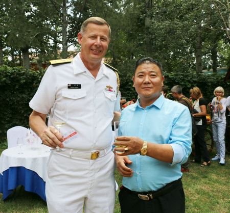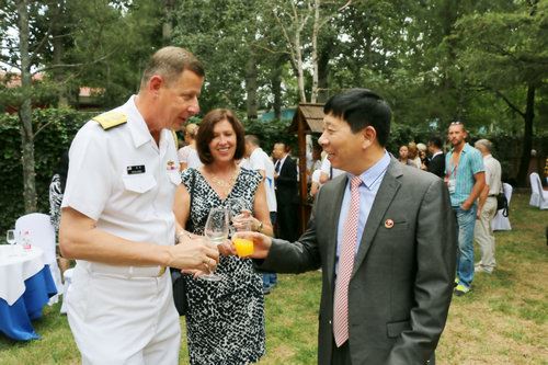 慈善企业家董铁棍和美国驻华大使馆国防武官、海军少将战森亲切交谈