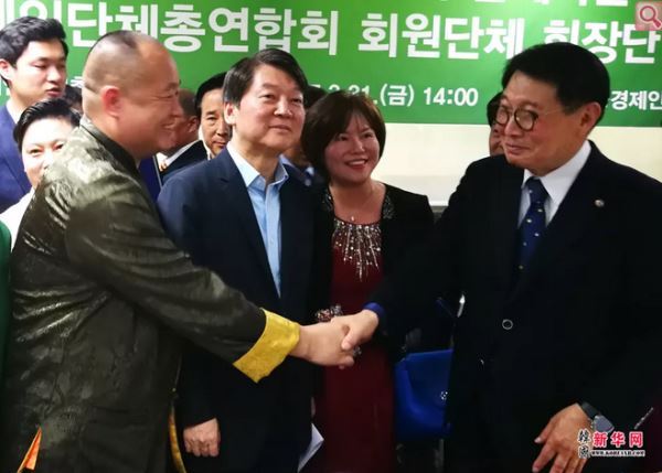 据韩国新华报 (记者 刘法仁 杨菊萍 摄影)报道)3月31日,韩国国民之党前党首、本届韩国总统热门候选人安哲秀,在韩国首尔市民团体总联合会办公室内,会见了海外华文新媒体合作委员会共同主席兼秘书长、世界侨报社长、中国著名影视导演陈俊余及韩国新华报社社长曹明权等人。 安哲秀在同陈俊余的会谈中首先强调,他本人及他的政党--韩国国民之党是热爱和平的,更是反对战争的正义之党。交谈中,安哲秀前党首还忧虑地指出,韩国因萨德的原因导致与中国关系紧张,韩国经贸遭受重创。因此他表示韩国政府应妥善处理好萨德问题,并希望尽早同中国恢复两国友好关系。 对此,陈俊余表示,做为海外华文媒体的代表,一定公开公正和客观求实地去报道自己的所见和所闻。并真诚地期待安哲秀前党首和韩国国民之党,能积极为促进中韩两国友好关系做出表率的作用。随后,双方在韩国全国社团总联合会吴昊锡总会长及韩国新华报社社长曹明权等人的见证下,安哲秀与陈俊余社长还联合签署了《与海外华文媒体一道倡仪‘爱和平、反战争’联合声明》。