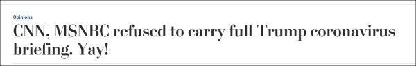 疫情严峻,美国总统特朗普每日都会和专家组召开疫情发布会,向美国观众介绍防疫情况。然而在4月1日的会上,因特朗普将会议重点转移到打击毒品、走私等与疫情无关的介绍上,美国有线电视新闻网(CNN)认为他试图将疫情会导向政治化,而微软全国广播公司(MSNBC)认为这无法为观众提供有价值信息,于是它们径直切断了直播信号。