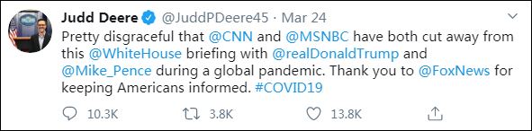 其实早前CNN和MSNBC均有切断过特朗普的疫情发布会。当时白宫发言人还发推批评称,这是“相当可耻的”,这些电视台没有完整的播完疫情发布会。同时发言人还感谢福克斯新闻让美国民众了解最新情况。