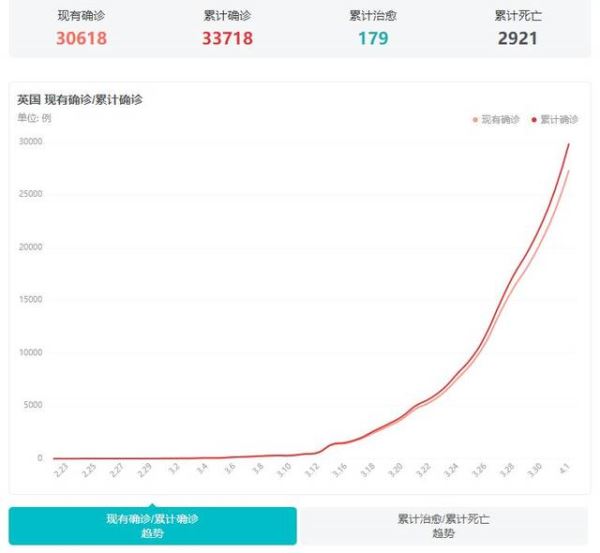 截至4月2日,英国新冠肺炎累计确诊病例突破3.3万例,累计死亡病例逼近3千例。