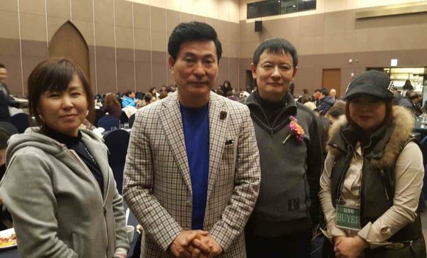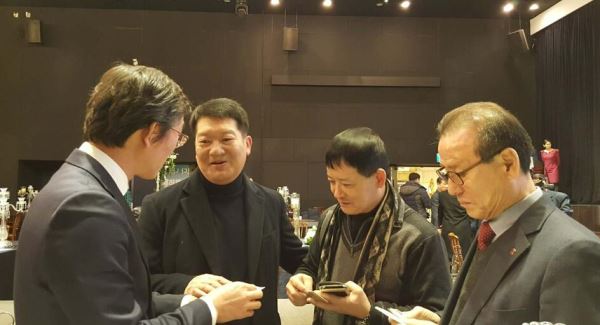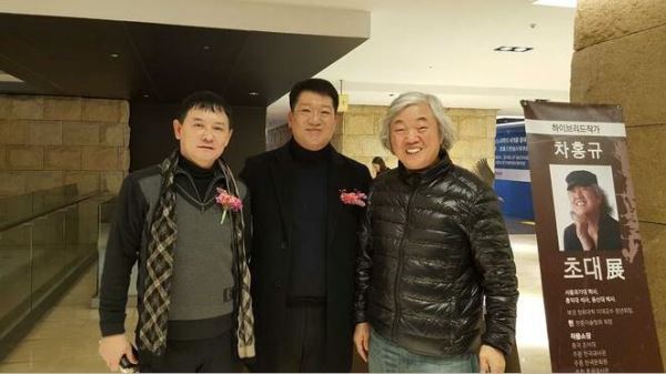 韩国全国韩籍华人总联合会总会长、韩国新华报社社长曹明权(左)同韩国IBN公司会长金邢昊(中)以及韩中书画家协会会长车洪圭(右)共同合影留念。
