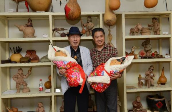 扈鲁向来访的韩国全国韩籍华人总联合会总会长、韩国新华报社社长曹明权介绍传统的中国葫芦文化。