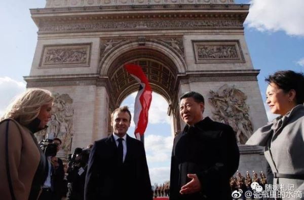 凯旋门下举行欢迎仪式很罕见。许多民众为了一睹盛况,寒风凛冽仍坚持全程观礼。