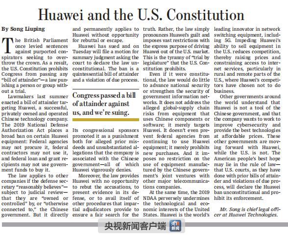 2019年5月28日美国《华尔街日报》 A18版 刊登了这一声明 (央视新闻客户端)