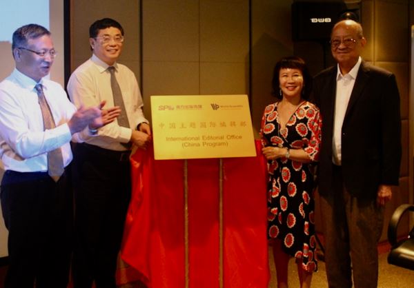 6月6日,广东省出版集团有限公司总经理杜传贵(左二)和新加坡世界科技出版公司主席潘国驹(右一)等为“中国主题国际编辑部”揭牌。