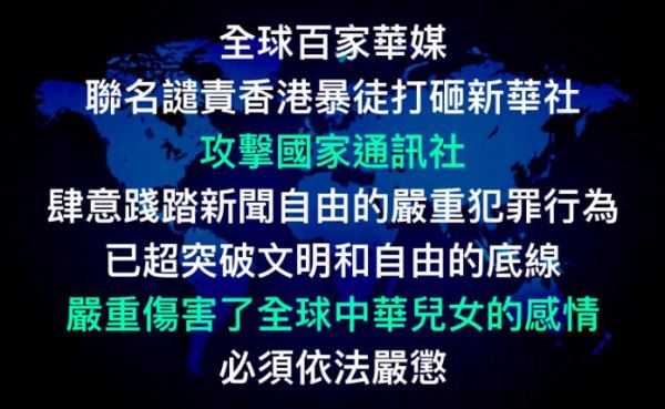 暴徒打砸國家通訊社的野蠻行徑已經超越法治、文明和自由的底線,嚴重傷害了14億中國人民,以及海外5600萬華人的感情。