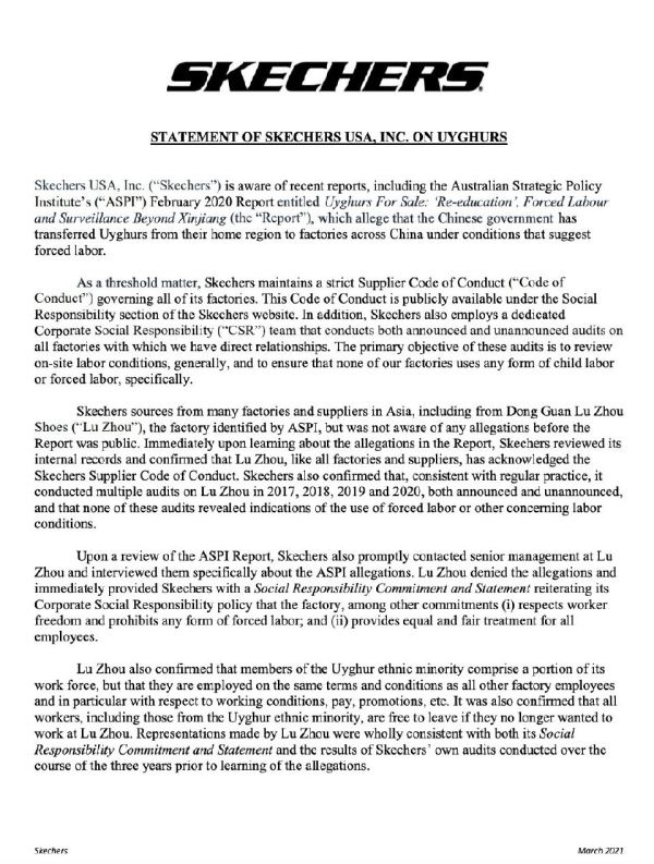 这个品牌就是Skechers,美国品牌。他们在自己的官网发了声明,公布了自己的调查结果。(声明原文附后)