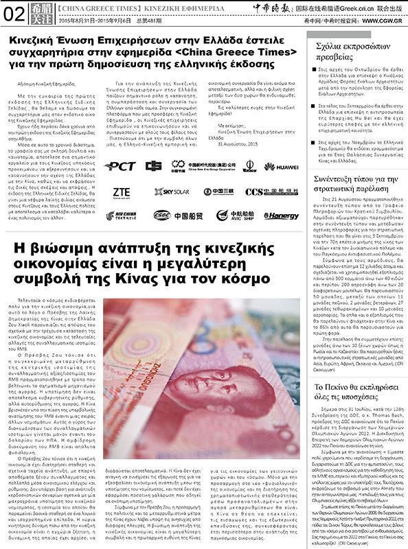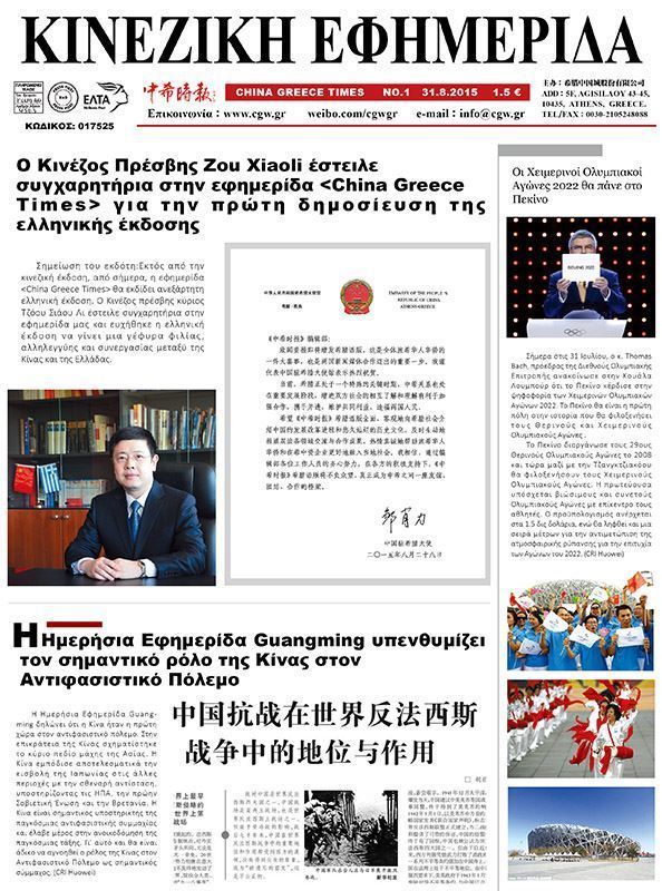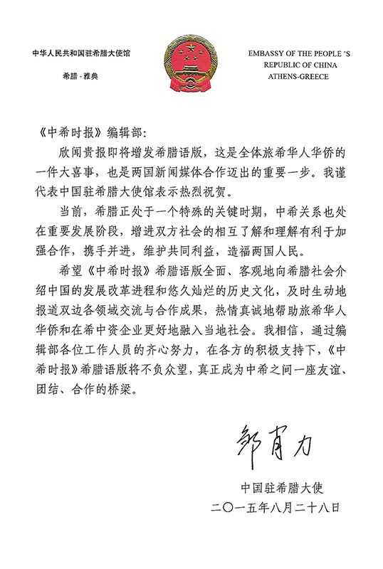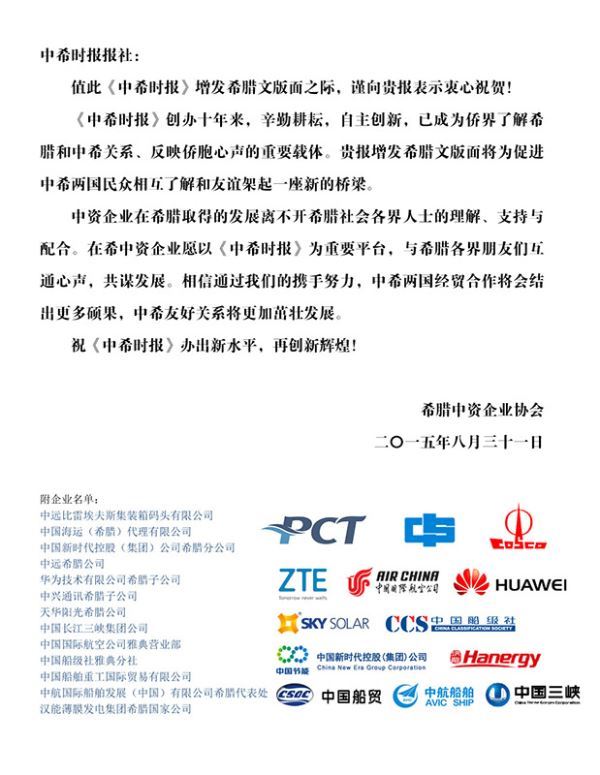 2015年8月31日,《中希时报》希腊文版正式对外发行,中国驻希腊大使邹肖力及希腊中资企业协会特此发来贺信,并寄语《中希时报》不负众望,真正成为中希之间一座友谊、团结、合作的桥梁。