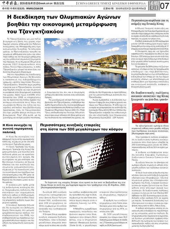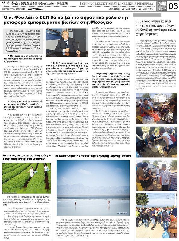 2015年8月31日起,创办十年的希腊独家华文报纸《中希时报》在原有中文版面基础上推出全新的希腊文版,旨在向希腊社会展示不断变化的中国,从全方位视角客观报道中国,真正成为中希之间一座友谊、团结、合作的桥梁。
