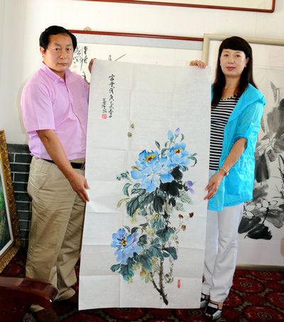 葛萍院长向许顺喜赠送自己亲笔创作的国画牡丹