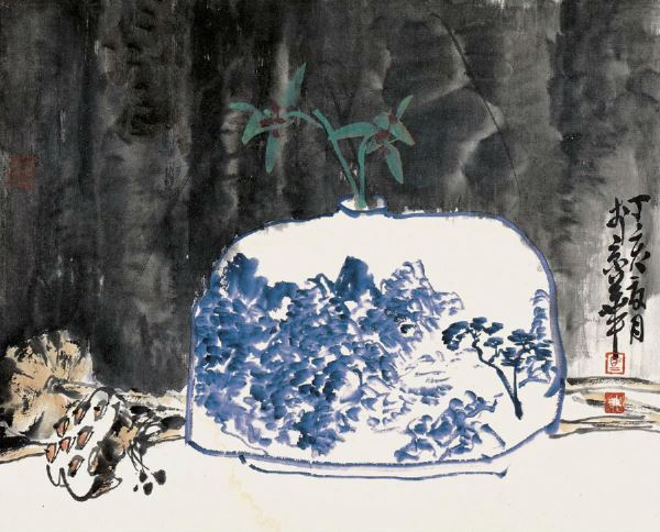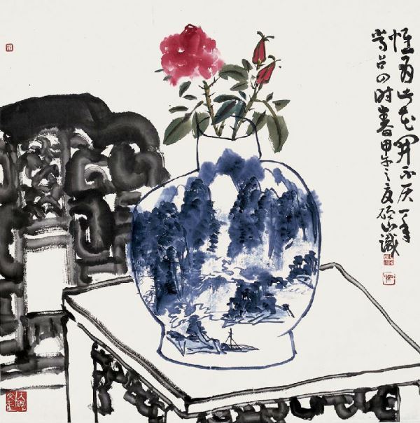 甚至可以这样认为,这些青花瓷瓶已不能够成简单意义上的一种文化参照,它的寓意是借用青花主题唤起我们是否还能在心灵与青花瓷之间建立起某种密不可分的文化关系,在其中找到一种久违的乡土气息般的亲切。从这个意义上看,马硕山反复表现的青花作品有着明显的初衷:在梦幻的境象中,由实现自我的情感归属深化为一种淡泊、宁静的人文归属。