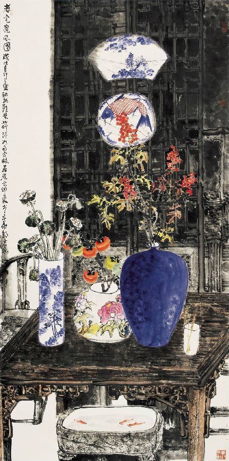 马硕山画笔下的青花瓷器,造型生动自然,既讲求形体轮廓刻画时的率意,又略带几分夸张变形。但从总体上说,它是灵动的,别致的,融合了中国古典瓷器传统内涵的形式美,在它的身上,晕染着浓重的文化气息与诗性,一种柔软的文化怀想与眷恋。马硕山画笔下的青花作品合理的汲取了宋词中的灵动、诗意、婉约与韵致,因而,画面在简明的青花主题中蕴含着一份凝练与简约,传达出的不是一种被宋词意象笼罩下的阴郁与优柔,孤寂与持重,而是通过古式家具、桌椅与青花瓷瓶的语境暗示,达成文化情结的集中化体现,在返古的意象中褪去历史的晦重与神秘,直指心灵,构建起一种通彻心扉,明快清朗的文化生态。