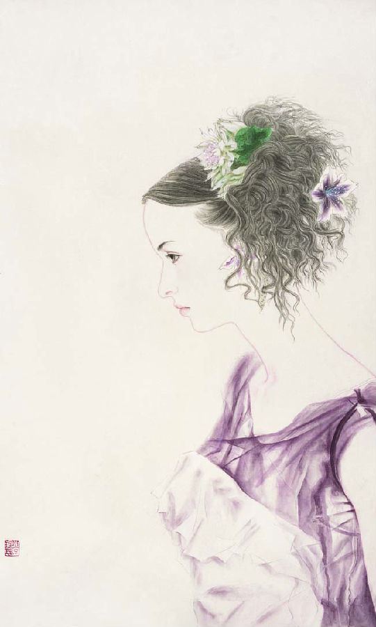 科学以理服人,艺术则是以情动人。艺术家在塑造艺术形象时离不开审美活动,而人的审美活动又总是同感情紧密联系在一起。艺术在创作中表达感情,欣赏时产生联想和共鸣,形成作者与观众之间的感情交流,艺术家能以自己的感情打动人心而感到欣慰。在中外艺术史上,自古以来就强调感情对艺术的重要作用。看袁玲玲的作品总会被他画面的感情气息所打动,似乎总在无意间就能触碰到你内心最深处的美好情感,她内心非常“理想化”,当然这种“理想化”并非是不谙世事,躲在自己所构筑的童话故事之中,而是在深谙事理之后有选择的保留这份纯净,是内心世界的自我抉择;展现在她的作品中就是美的色彩、美的旋律所萦绕的画面美的诗意,那种美的精神使人体验到生活,并享受到生活。她的绘画弱化了描述性,强化了表现性,她把细腻美好的生活体验隐藏在优雅的人物造型和鲜活的色彩之中,营造了一个女性特有的感性和唯美世界。好的作品不仅仅限于画面的效果,更多的是一种气度,它就像一棵充满蓬勃生命力的树一样感染着观者。让观者感受到你的心境、心态,感受到你对对象的体悟。袁玲玲正是立足这一层面进行自己的创作的,看她的作品不需要解释就能够看得舒心,想的舒畅。看着她那干净的色彩、单纯的形式,我们几乎能够看到艺术家心灵的明净与透亮。看袁玲玲的绘画,能让我们的视点脱离光怪陆离的现实世界,而回归最单纯的诗意空间,享受一种恬静、优雅与自得,品味着单纯中包含的无穷境界。她的研究生毕业作品《似水流年》四联画系列给我们留下了深刻的印象:作者以严谨的造型,浪漫的表现,传达崇高的人文关怀为主旨,画面中人物的每个动作,每个表情都在精心的刻画下传达着世人的心声,全幅画以一种玫瑰紫灰的色调渲染着一个女性眼睛里的独特世界,在各种紫色中调配各个阶段不同的情感体验:正像袁玲玲自己所述:“恋爱的青涩、新娘的娇羞、孕育的期盼、初为人母的幸福,都在眼眸、唇齿、举止间流动……,几株无理的花草散漫生长开来,每个阶段盛开着不同的花朵,是一种理想、一种隐喻:玫瑰般的恋爱浓烈而娇艳;百合般的婚姻娇艳而圣洁;莲花般的孕育圣洁而美丽;牡丹般的深情美丽而永恒!繁华的生长在无理的情感枝蔓上,缠缠绕绕,难解难分,一辈子,一世情,无论怎样纠结,也要终老一生。”在勾线晕染中保留着纯粹,在玫瑰紫灰中突破着传统,在无尽的浪漫、神秘、温馨的氛围中沁润着心灵,在气韵流动中传达最为朴素、真挚、温暖的人世之情!