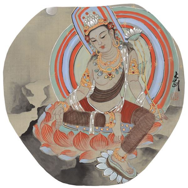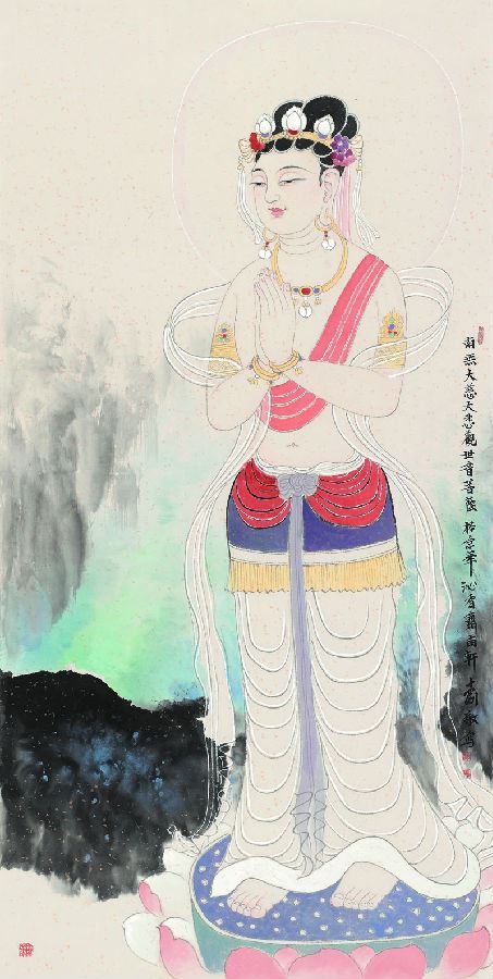 在与孟刚的接触中我发现他是一个心怀慈悲的人。慈悲的人都心底平和,情感细腻。他的每幅作品的成功都来自他详细的观察。女性的一颦一笑,一呼一吸都看在他的眼里;女性起伏的肢体变化,衣裙褶皱的扭动都融进在他的心中。这些美若音乐的动人韵律已融入到他的血液,他只要一动笔对女性的礼赞就随着水墨涌出,涌到温软的宣纸上,成就出一帧帧清澈明丽的画卷。孟刚画面上的女孩甜美纯净如邻家小女;画面里作为背景的清泉山石,草木雨露又似仙境一般温润人心,观者在饱餐秀色之后无不意欲夺之。