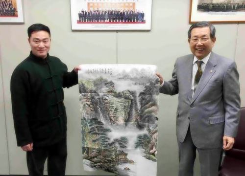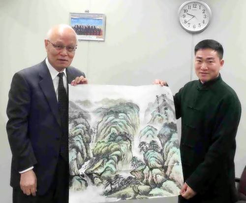 王余根国画被日中经济贸易理事长(右)青木俊一郎收藏