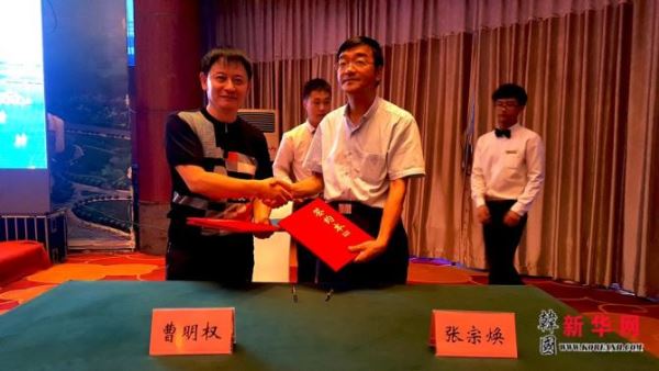 韩国全国韩籍华人总联合会总会长、韩中自由贸易(FTA)民间商贸委员会首席副委员长、韩国新华报社社长曹明权(左)代表海外华文媒体与日照市侨联张宗焕(右)主席,共同签署了海外三招三引联络站备忘录协议书后合影留念。