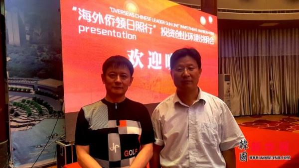 韩国全国韩籍华人总联合会总会长、韩中自由贸易(FTA)民间商贸委员会首席副委员长、中共日照市委副书记孟庆斌(右)同韩国全国韩籍华人总联合会总会长、韩中自由贸易(FTA)民间商贸委员会首席副委员长、本报社长曹明权(左)一起。
