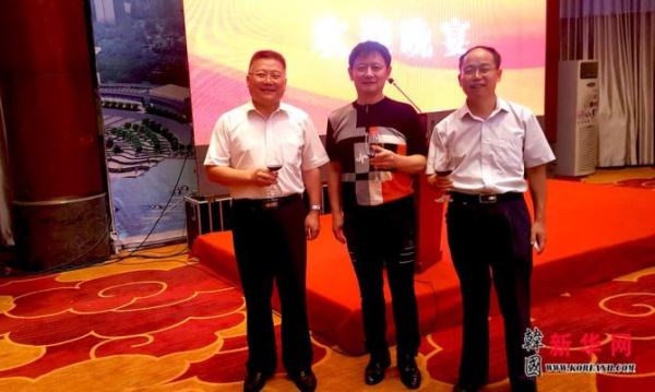 中共日照市委副秘书长兼办公室主任李卫东(左)、日照市侨联党组书记刘海诚(右)同韩国全国韩籍华人总联合会总会长、韩中自由贸易(FTA)民间商贸委员会首席副委员长、本报社长曹明权(中)一起。