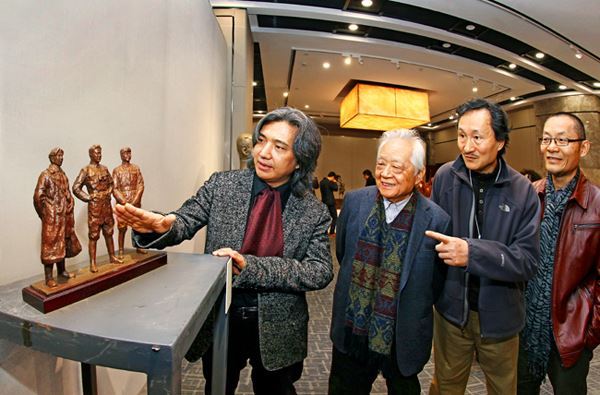 中国美术馆馆长、中国美术家协会副主席、中国城市雕塑家协会主席吴为山与著名雕塑艺术家盛杨等艺术家在展览作品前交流