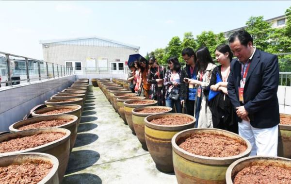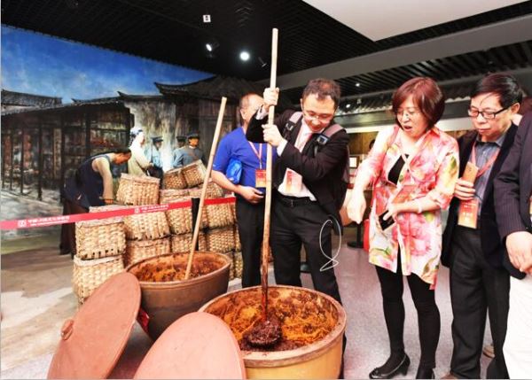 海外华文媒体一行在中国・川菜体验园体验郫县豆瓣制作过程。安源摄影