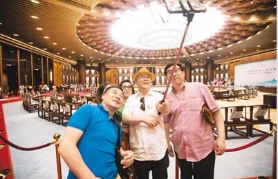 采风团成员在G20杭州峰会主会场自拍留影。 本报记者 杨俊峰摄