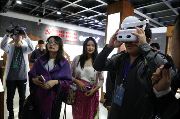 在丽江古城5G体验馆,华媒代表戴上VR眼镜,身临其境观赏古城风景。(海外网 谢明 摄)