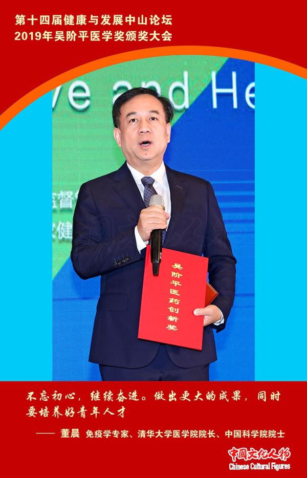 免疫学专家、清华大学医学院院长、中国科学院院士董晨发表获奖感言,表示今后要不忘初心,继续奋进。做出更大的成果,同时要培养好青年人才