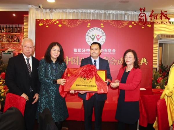徐伟丽参赞,蔡文显荣誉会长,陈强会长,马丽梅监事长共同为葡萄牙北方侨商会揭牌。