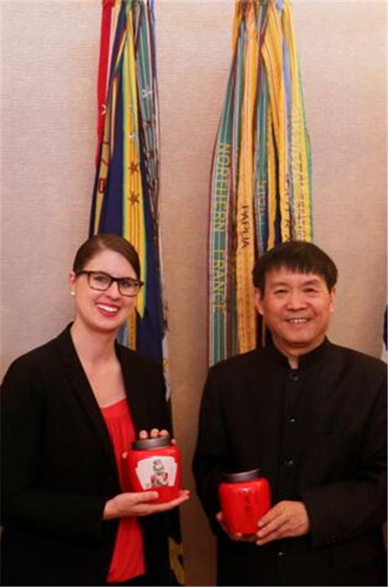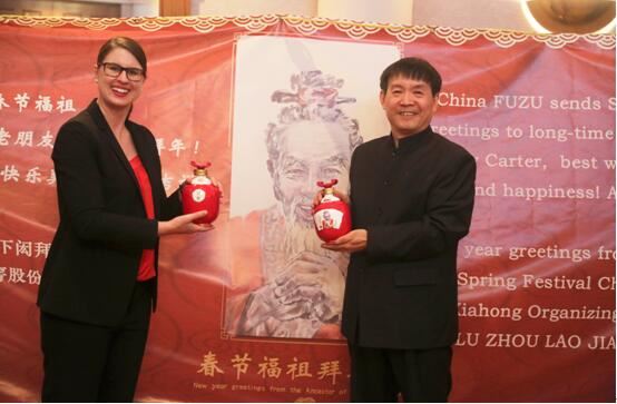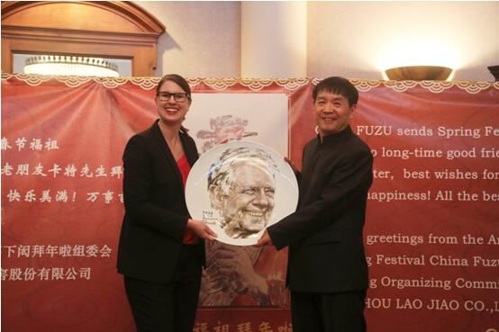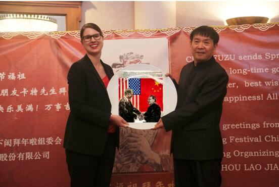 在美国亚特兰大卡特中心美国前总统卡特专用接待贵宾会议厅,美国前总统卡特先生的代表马美真女士代表卡特先生接受春节福祖拜年活动向卡特先生拜年。图为于成松向卡特先生的代表马美真女士递交春节福祖拜年啦国窖1573万事吉祥纪念酒鼎。