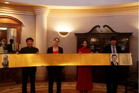 在美国亚特兰大卡特中心美国前总统卡特专用接待贵宾会议厅,美国前总统卡特先生的代表马美真女士(左二)、与于成松(左一)及于成松的夫人张玫(右二)、中国人民大学北美校友会协调人王学东(右一)共同拿着以小楷艺术书写的“习近平用典”和中国历史名人肖像组成的《习近平用典艺术长卷》,向卡特先生拜年。