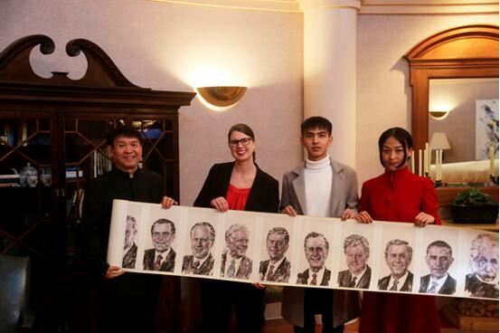在美国亚特兰大卡特中心美国前总统卡特专用接待贵宾会议厅,卡特先生的代表马美真女士(左二)与于成松(左一)及于成松的夫人张玫(右一)儿子于其安(右二)共同拿着包括卡特先生在内的《你好,美国!影响世界百位美国人于成松中国画大写作品》(高仿)艺术长卷,向卡特先生拜年。