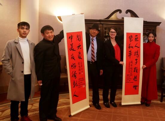 在美国亚特兰大卡特中心美国前总统卡特专用接待贵宾会议厅,卡特先生的代表马美真女士(右二)代表美国前总统卡特接受拜年。图为于成松(左二)、中国人民大学北美校友会协调人王学东(左三)及于成松的夫人张玫(右一)儿子于其安(左一)举着由诗人彭鸣撰文、书法家王书科书写的专门为卡特先生制作的对联,向卡特先生拜年。