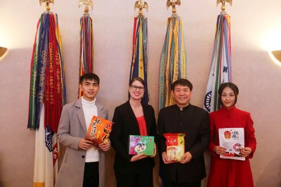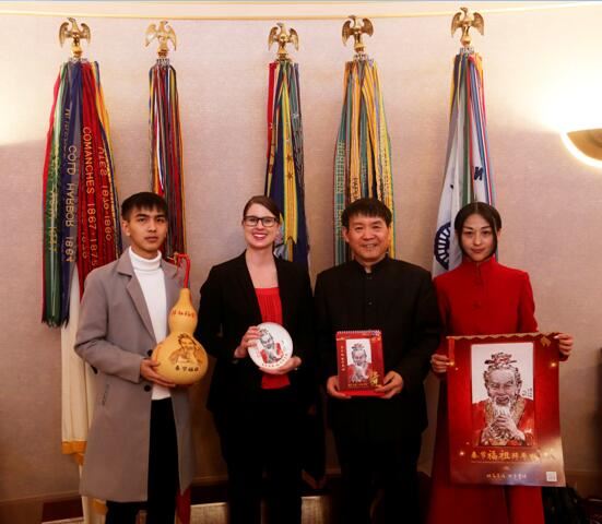 在美国亚特兰大卡特中心美国前总统卡特专用接待贵宾会议厅,美国前总统卡特先生的代表马美真女士(左二)与于成松先生(右二)及夫人张玫(右一)、儿子于其安(左一),分别拿举着绘制有春节福祖落下闳画像,象征福禄寿喜的工艺葫芦,春节福祖艺术瓷屏,包括春节福祖落下闳在内的《中国古代科学家挂像》《中国当代科学家挂像》艺术台历和“春节福祖拜年啦”万事吉祥图卡,向卡特先生拜年。
