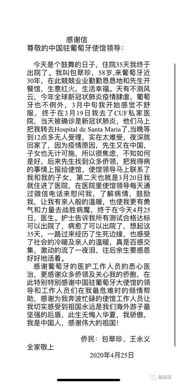 【葡新报 里斯本讯】在这次全球性疫情中,任何国家任何民族都无法置身事外。葡萄牙的中国人自我防护意识很好,从最初的华人返葡隔离到后期自己在家里隔离,大家都很自觉。但是,病毒毕竟是恶狠狠的,3月,里斯本也出现了首例华人感染者,但是,经过35天的住院治疗,现在已经病愈出院。