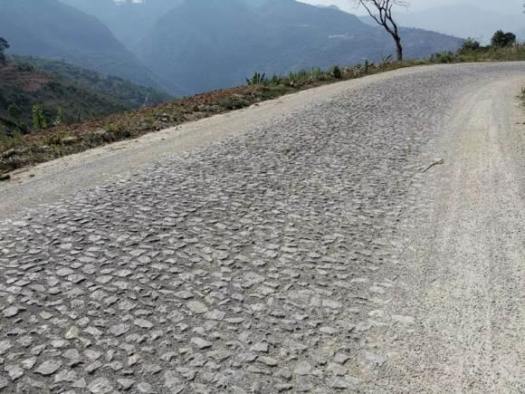 在保存完好的一段著名的塘石路路面,我们下了车,仔细地端详着历八十年风雨沧桑而不改旧样的滇缅公路,路面的设计恐怕为目前国内所仅有,石头被深埋地下,而露出地面的是整齐划一的小方石,崇山峻岭间,既可防止汽车轮胎打滑,又可避免雨水冲垮了路面。