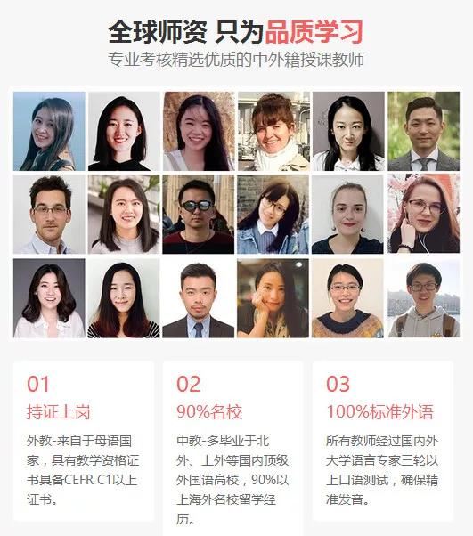 90%名校出身:中教毕业于北外、上外等国内TOP10的顶级外语高校,90%以上海外名校留学经历。