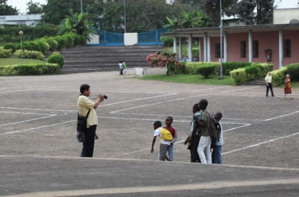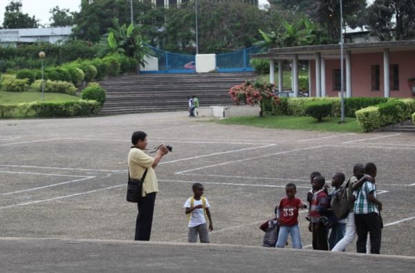 中国驻科特迪瓦商务参赞庞璐为孩子们拍照留影。