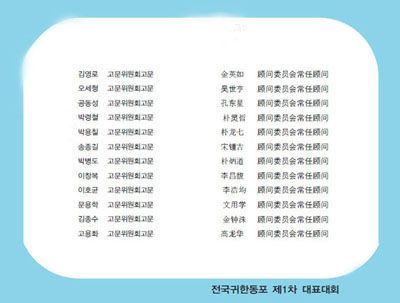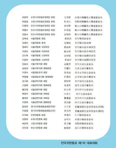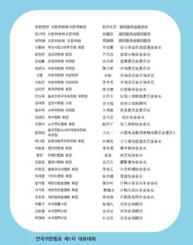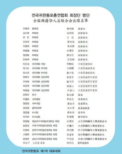 出席参加全国韩籍华人华裔第一次代表大会的全国韩籍华人总联合会会长团分别是: