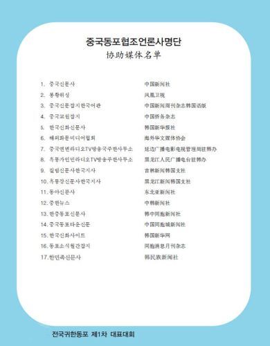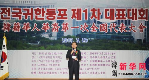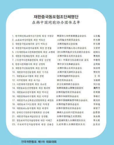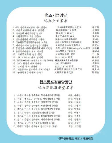 由全国韩籍华人总联合会主办、在韩同胞团体协议会承办、国会议员后援赞助场地以及(株)春秋国际旅行社、CK女性委员会、在韩同胞新闻媒体联合会等协办的全国韩籍华人华裔第一次全国代表大会在韩国国会议员会馆大会议室(大礼堂)内隆重举行。