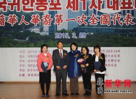 在全国韩籍华人华裔第一次代表大会上荣获国会议员辛京珉表彰的优秀同胞代表们合影留念。